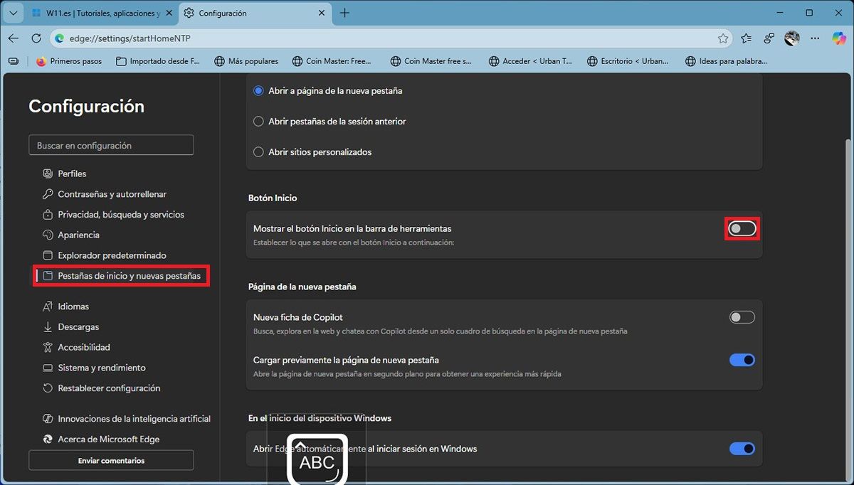 - Clica en la opción que dice “Pestañas de inicio y nuevas pestañas” (en la parte izquierda).