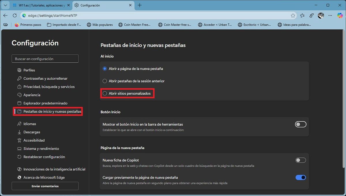 - Ve a la sección “Pestañas de inicio y nuevas pestañas”.