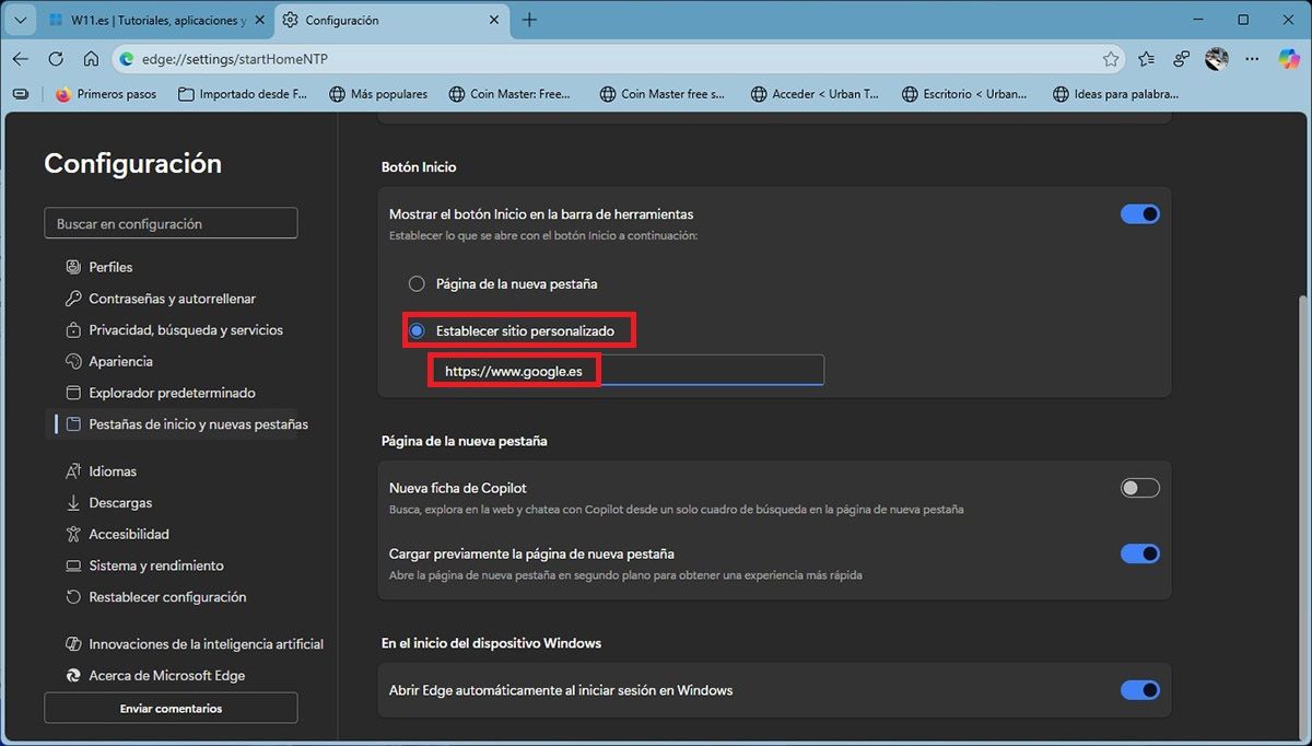Por otro lado, si lo que buscas es que Edge abra automáticamente una web concreta al arrancar, deberás seguir estos pasos: