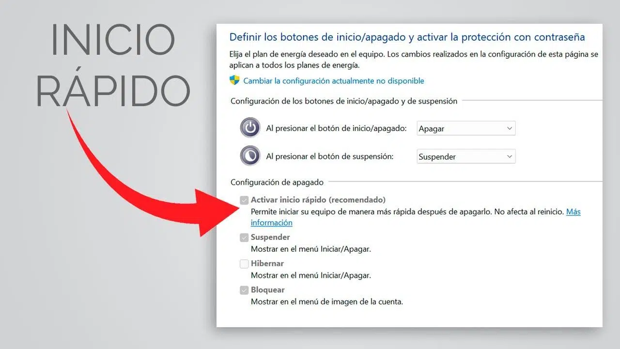 Al entrar ahí verás una sección llamada Configuración de apagado. Es donde suelen aparecer las casillas de Activar inicio rápido (recomendado), Suspender, Hibernar, etc. Es posible que de primeras no puedas cambiar nada: en ese caso, pulsa arriba en Cambiar la configuración actualmente no disponible y acepta con una cuenta con permisos de administrador.